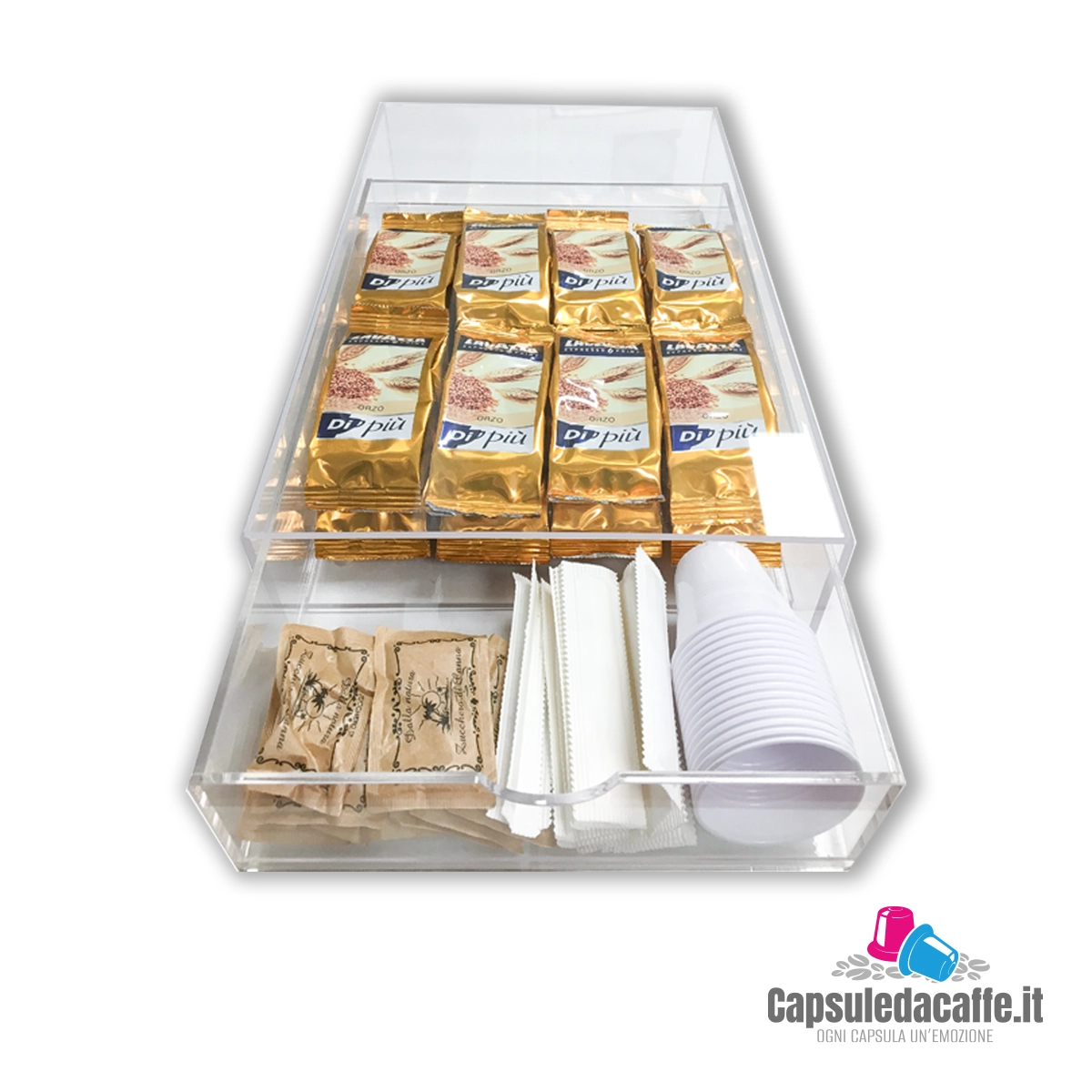 Pratico dispenser a cassetto e base per la macchina del caffè, moderno ed elegante, per la sistemazione di cialde, zucchero, palette e bicchierini in maniera ordinata, con un minimo di ingombro e ben protette dalla micro polvere.